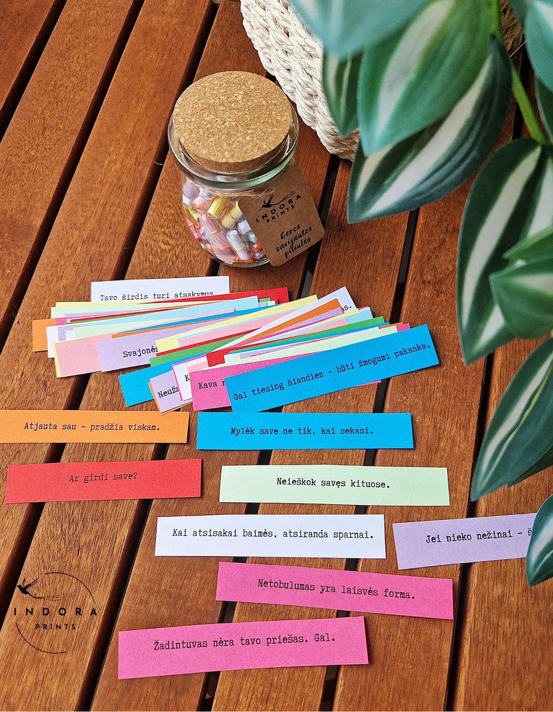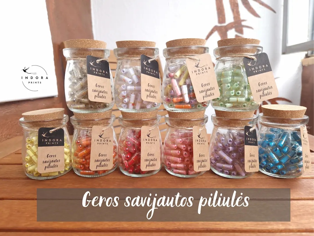 ✨ „Geros savijautos piliulės“ – stiklinis indelis su 64 spalvotomis „piliulėmis“, kurių viduje slepiasi įkvepiančios žinutės. Maža dovana, kuri džiugins ilgiau nei 2 mėnesius ir kasdien primins apie šilumą, stiprybę bei pozityvumą. Galima rinktis iš 10 skirtingų spalvų – kiekvienam skoniui ir nuotaikai. 🌈