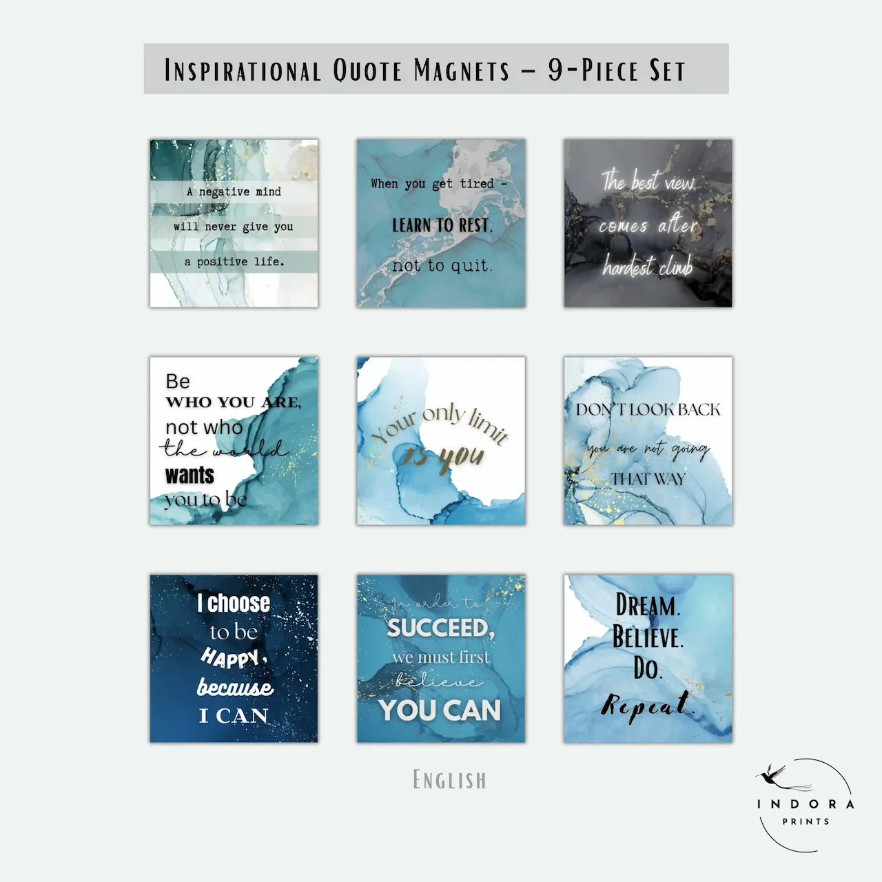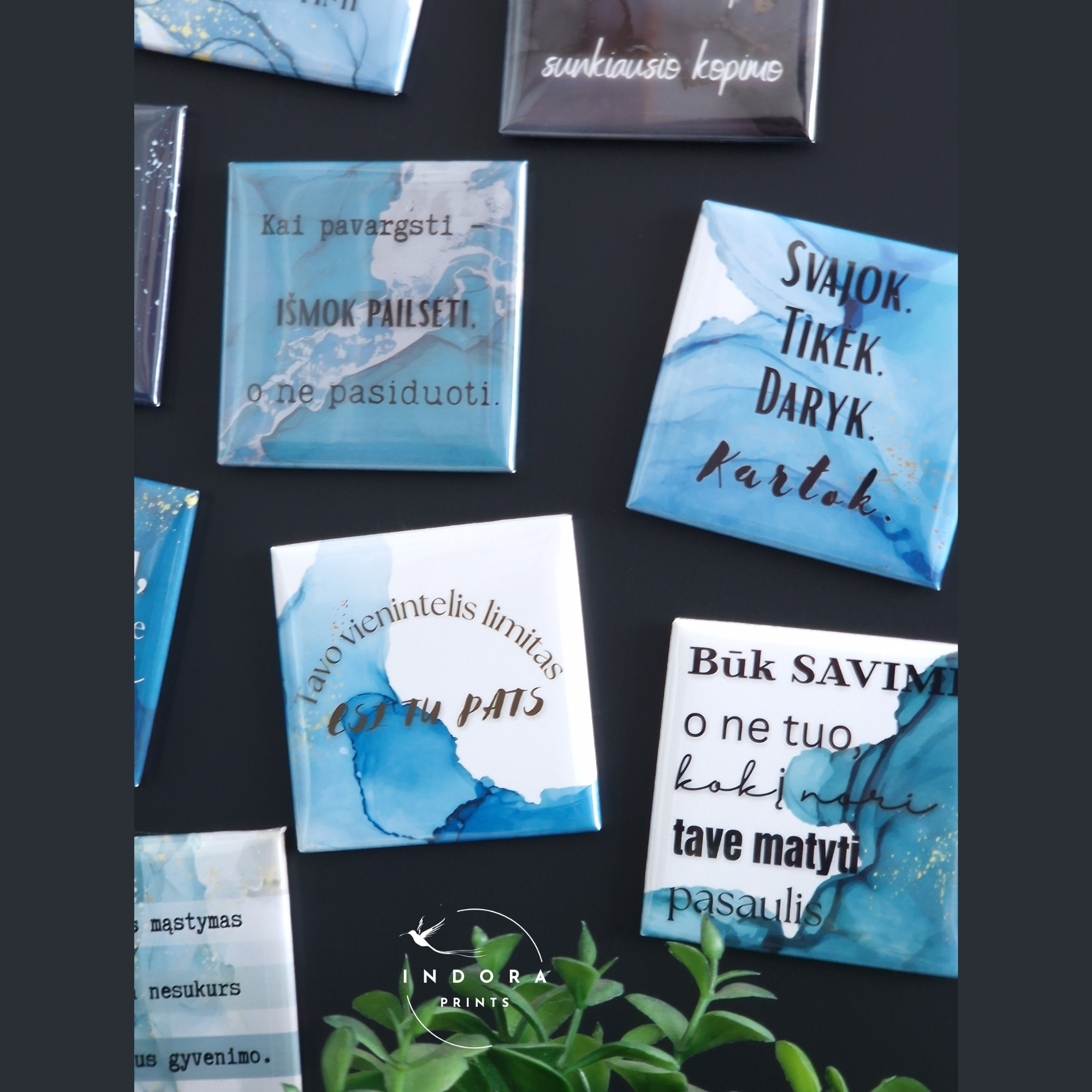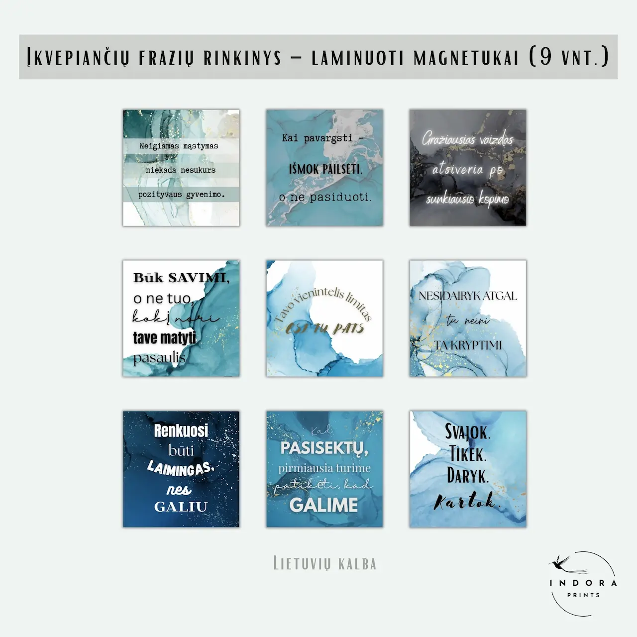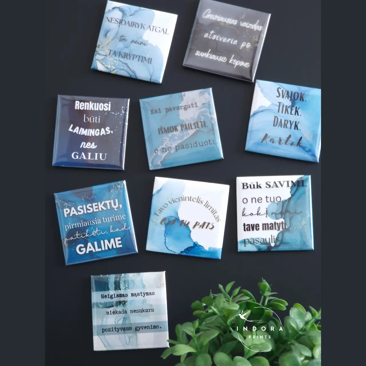 Rinkinyje rasite 9 laminuotus magnetukus su įkvepiančiomis frazėmis, kurias galima pasirinkti lietuvių arba anglų kalba.