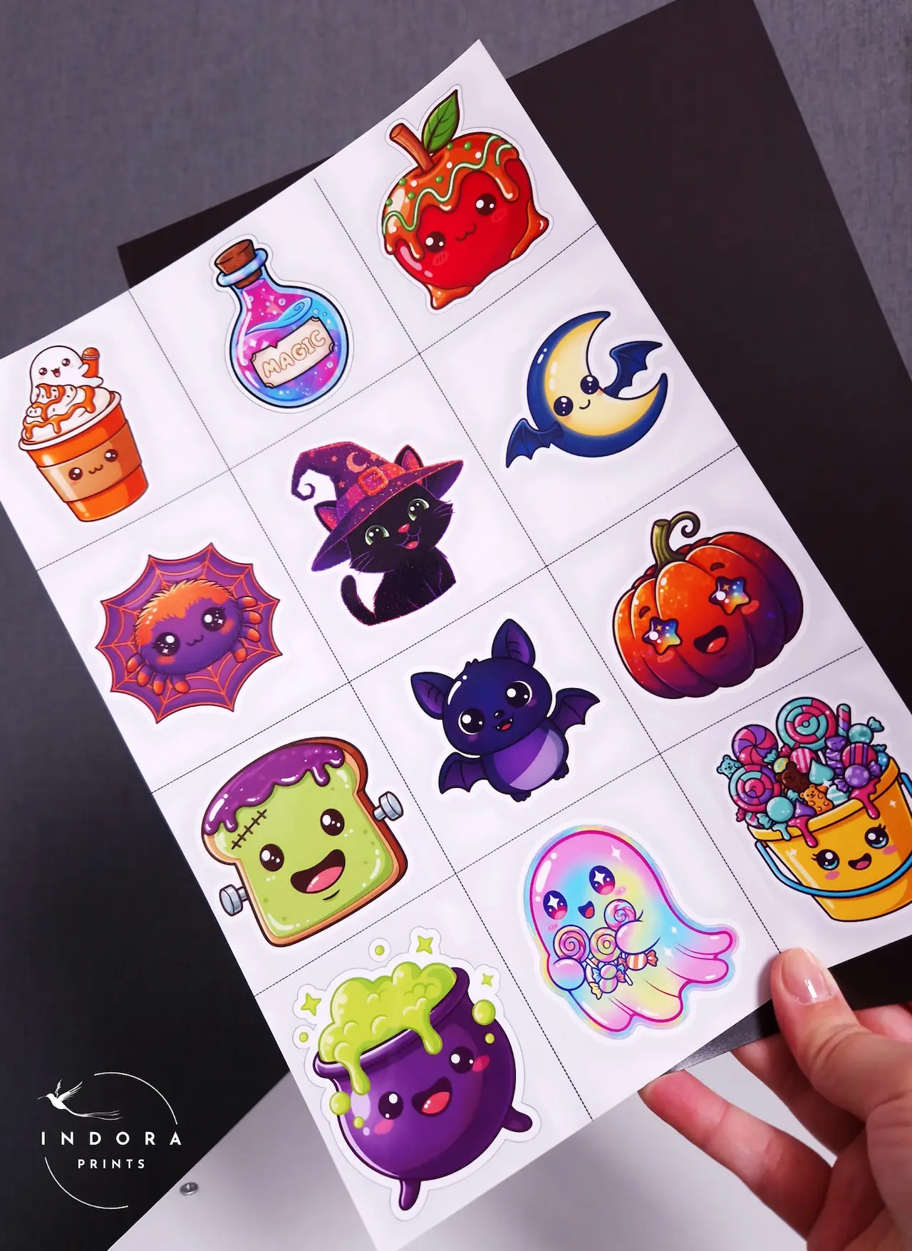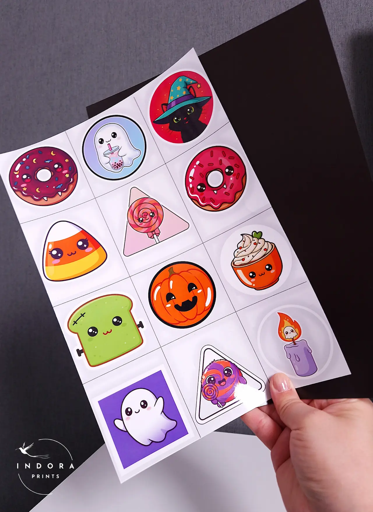 🧲 1 A4 formato laminuotas lapas su 12 žaismingų paveiksliukų (temos: Helovynas 🎃 arba Skanėstai 🍩)