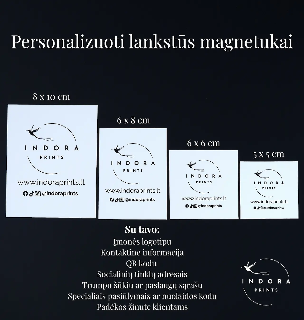 Magnetukai gaminami pagal individualų užsakymą, tad galėsite integruoti savo logotipą, kontaktus, QR kodą, šūkį ar kitą norimą informaciją.